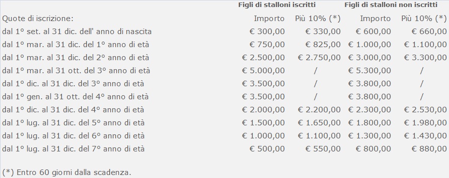 E’ inoltre dovuto un “office charge” di: € 20,00 per ogni associazione, € 50,00 per ogni nuovo stallone,